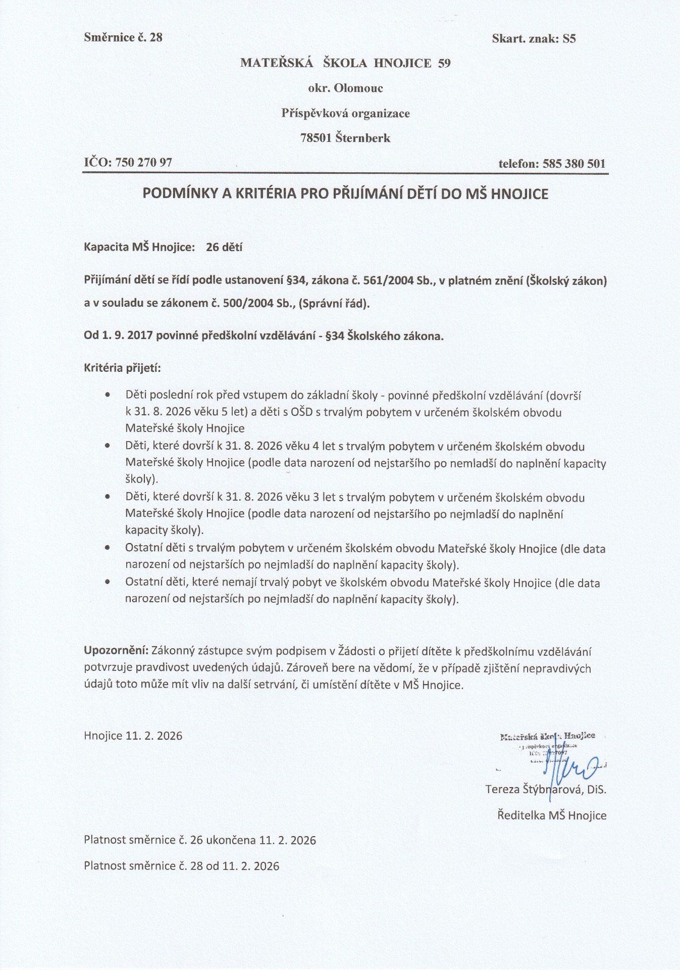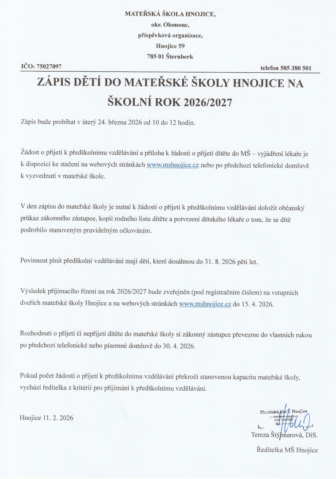 Naše mateřská školka je jednotřídní, s kapacitou 26 dětí a je umístěna v přízemí budovy bývalé základní školy. Od roku 2003 jsme samostatný právní subjekt. Zaměstnanci mateřské školy se snaží o vytvoření důvěrného prostředí mezi dětmi a dospělými, ve vzájemných vztazích kladou důraz na toleranci, zdvořilost, vzájemnou pomoc a podporu. Vzdělávací činnost mateřské školy je zaměřena na estetickou výchovu, na poznávání přírody, vlastní kultury, na posilování úcty k rodině, tradicím, národním hodnotám země. Mateřská škola dosahuje výborných výsledků při výchově sounáležitostí dětí s prostředím, ve kterém žijí.